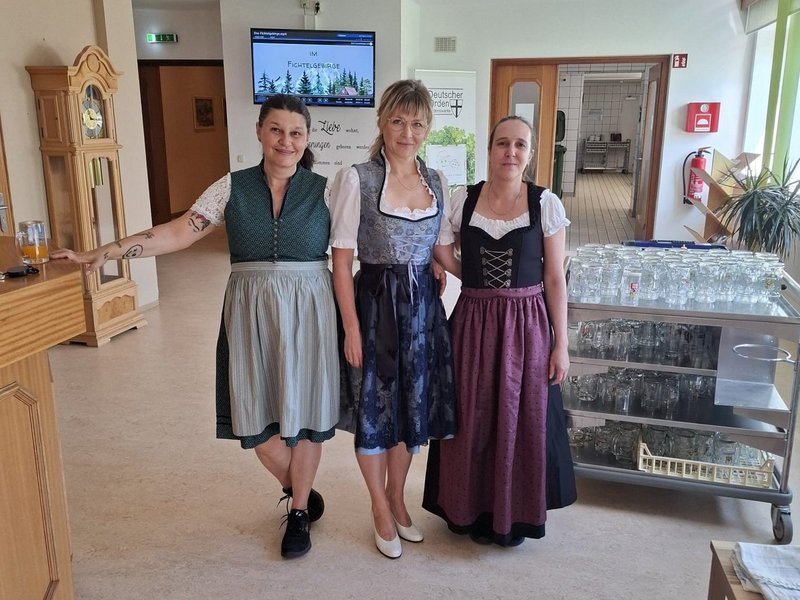 Die Gottesdienste fanden diese Woche im Pavillon und im Freien statt - eine schöne Abwechslung für alle. Den Abschluss der Woche bildete unser Sommerfest, natürlich im Dirndl. Trotz Hitze wurde ordentlich das Tanzbein geschwungen. Das schöne Wetter lockte am Nachmittag noch unseren „Fichtelgebirgler“ hervor, der uns von seinen Wanderungen berichtete.