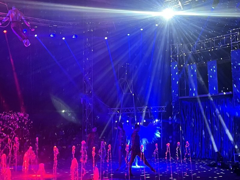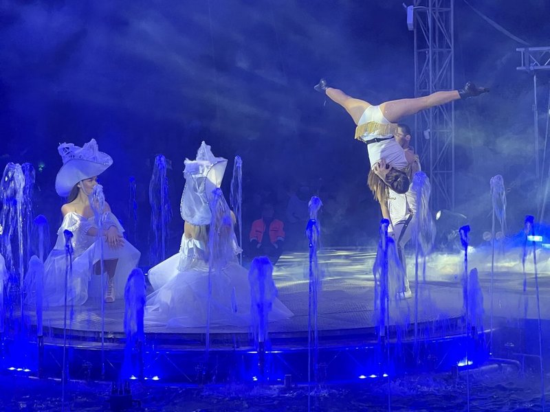 Mit Popcorn und musikalischer Begleitung konnte man die vielfältigen akrobatischen Kunststücke bestaunen: Ein Wasserballett in Begleitung von Fontänen und fliegenden Engeln. Zum Ende der Show wurde es noch feurig, als Feuerspucker den krönenden Abschluss lieferten.