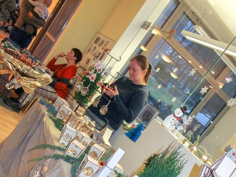Zwölf Tische mit Christstollen, Gebasteltem und Kunsthandwerk waren aufgebaut, davon elf von externen Händlern. Der schönste und größte Stand war aber unser eigener. Möglicherweise hatte sich unser Hausmeister besonders viel Mühe mit dem Stand gegeben, weil seine Frau bei uns im Betreuungsteam arbeitet.