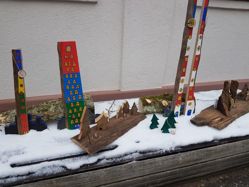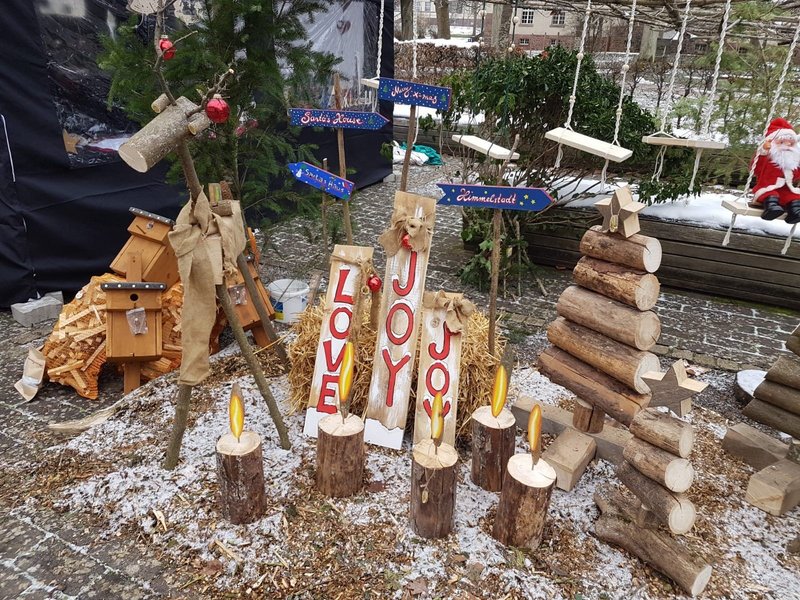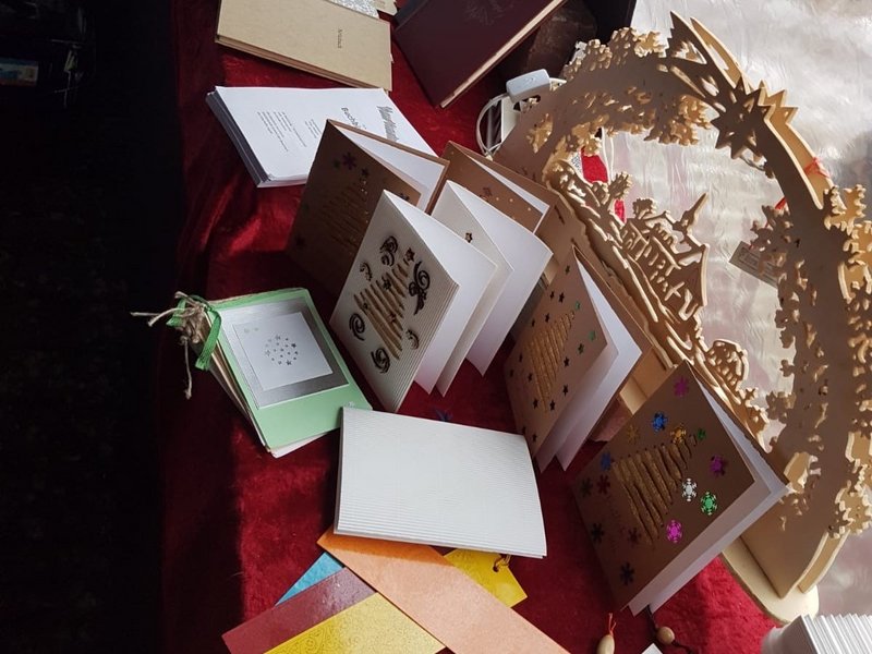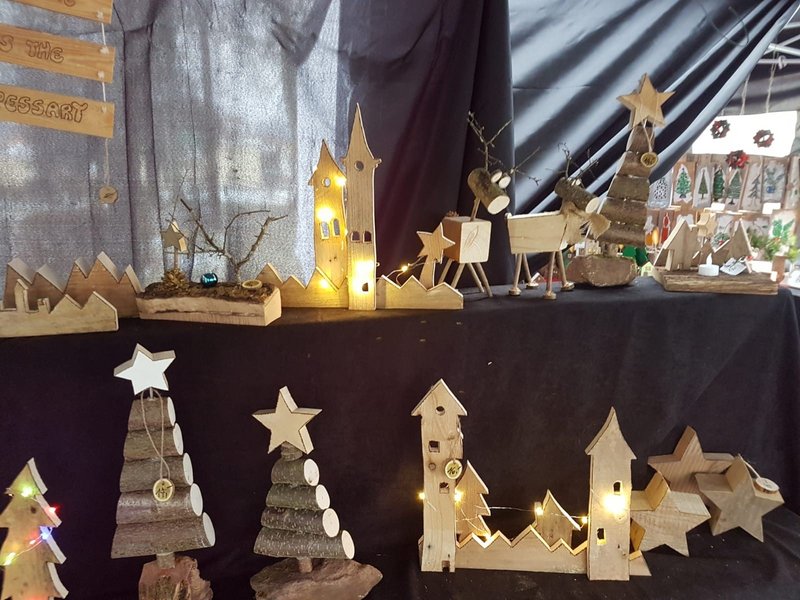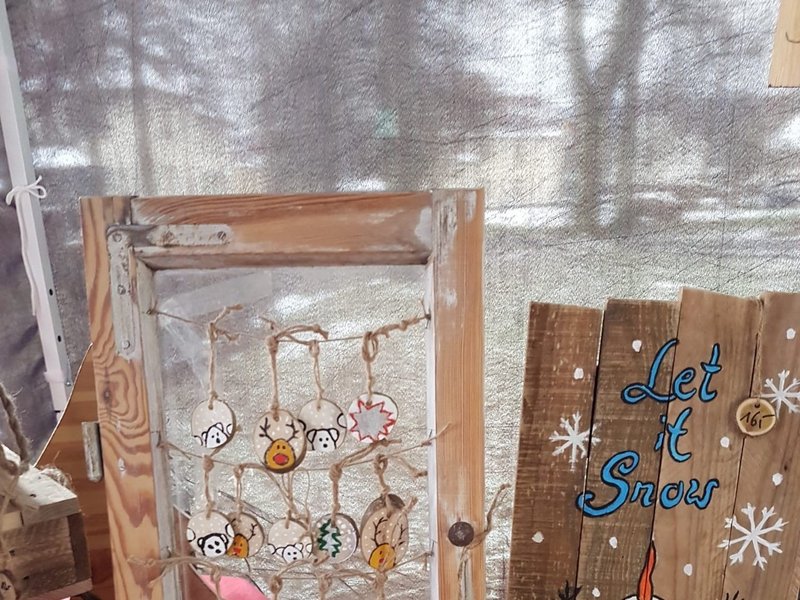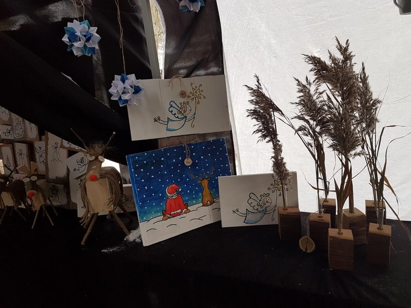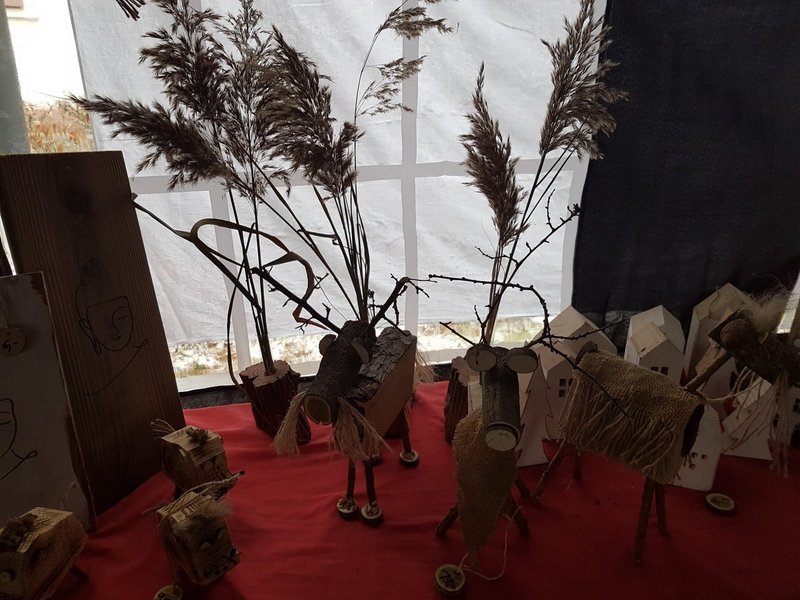 Die Buchbinderei kreierte Weihnachts- und Glückwunschkarten, Blöcke und Notizbücher sowie stilvolle Makrameearbeiten. Die AT-Kunst fertigte vor allem Dekoartikel, welche durch Upcycling aus alten Balken, Palletten und Brettern gewonnen wurde. Daraus entstanden Sterne, Weihnachtsbäume, Häuser, Landschaften, Rentiere sowie bunte Bilder mit Weihnachtsmotiven. Aus der Hauswerkstatt kamen noch Nistkästen, Vogelhäuser und Insektenhotels zum Angebot hinzu.